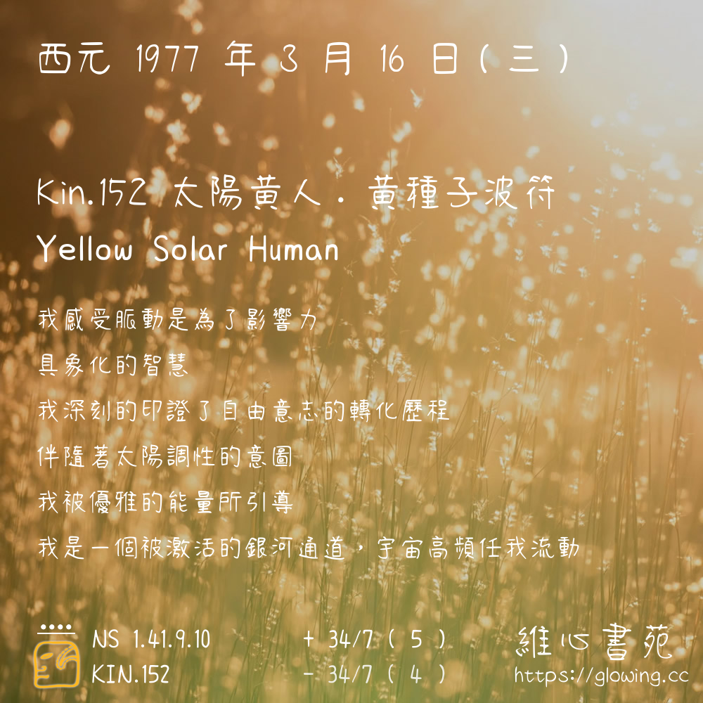 我們可以稱 KIN 152 為 【太陽黃人】 、 【太陽的黃人】 、 【黃種子波符 之 太陽黃人】 也可以是 【太陽黃人.黃種子波符】 ,你比較喜歡哪一個稱號呢?
