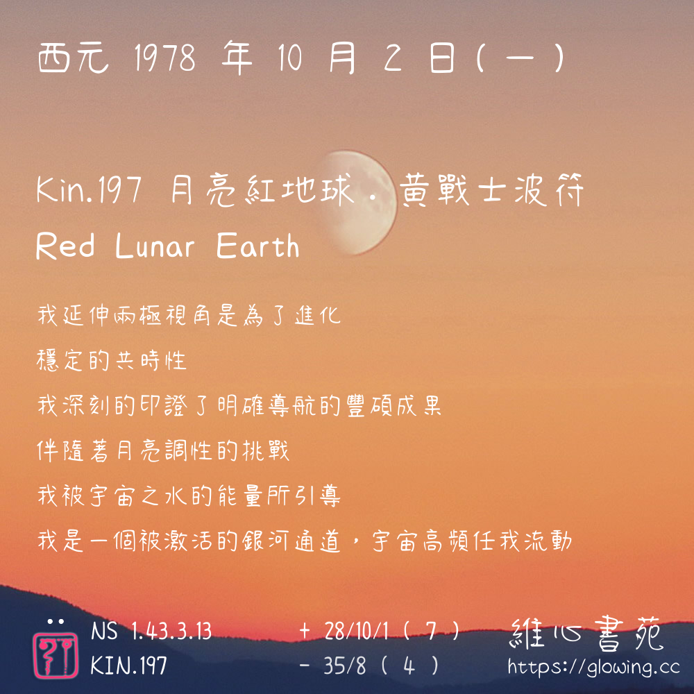 我們可以稱 KIN 197 為 【月亮紅地球】 、 【月亮的紅地球】 、 【黃戰士波符 之 月亮紅地球】 也可以是 【月亮紅地球.黃戰士波符】 ,你比較喜歡哪一個稱號呢?