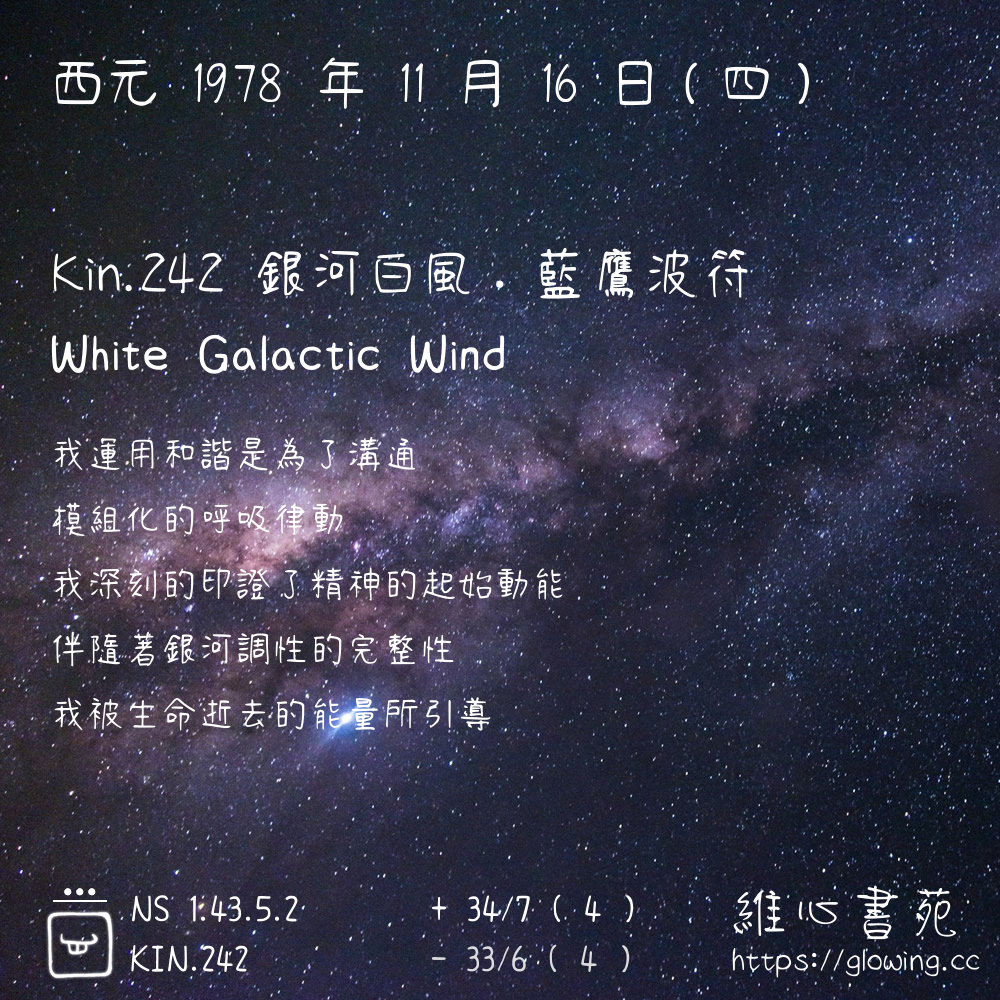 我們可以稱 KIN 242 為 【銀河白風】 、 【銀河的白風】 、 【藍鷹波符 之 銀河白風】 也可以是 【銀河白風.藍鷹波符】 ,你比較喜歡哪一個稱號呢?