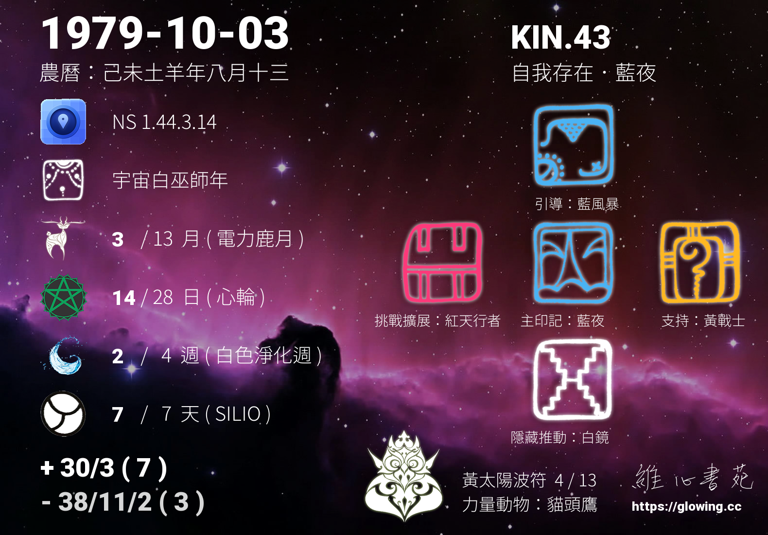 我們可以稱 KIN 43 為 【自我存在藍夜】 、 【自我存在的藍夜】 、 【黃太陽波符 之 自我存在藍夜】 也可以是 【自我存在藍夜.黃太陽波符】 ,你比較喜歡哪一個稱號呢?