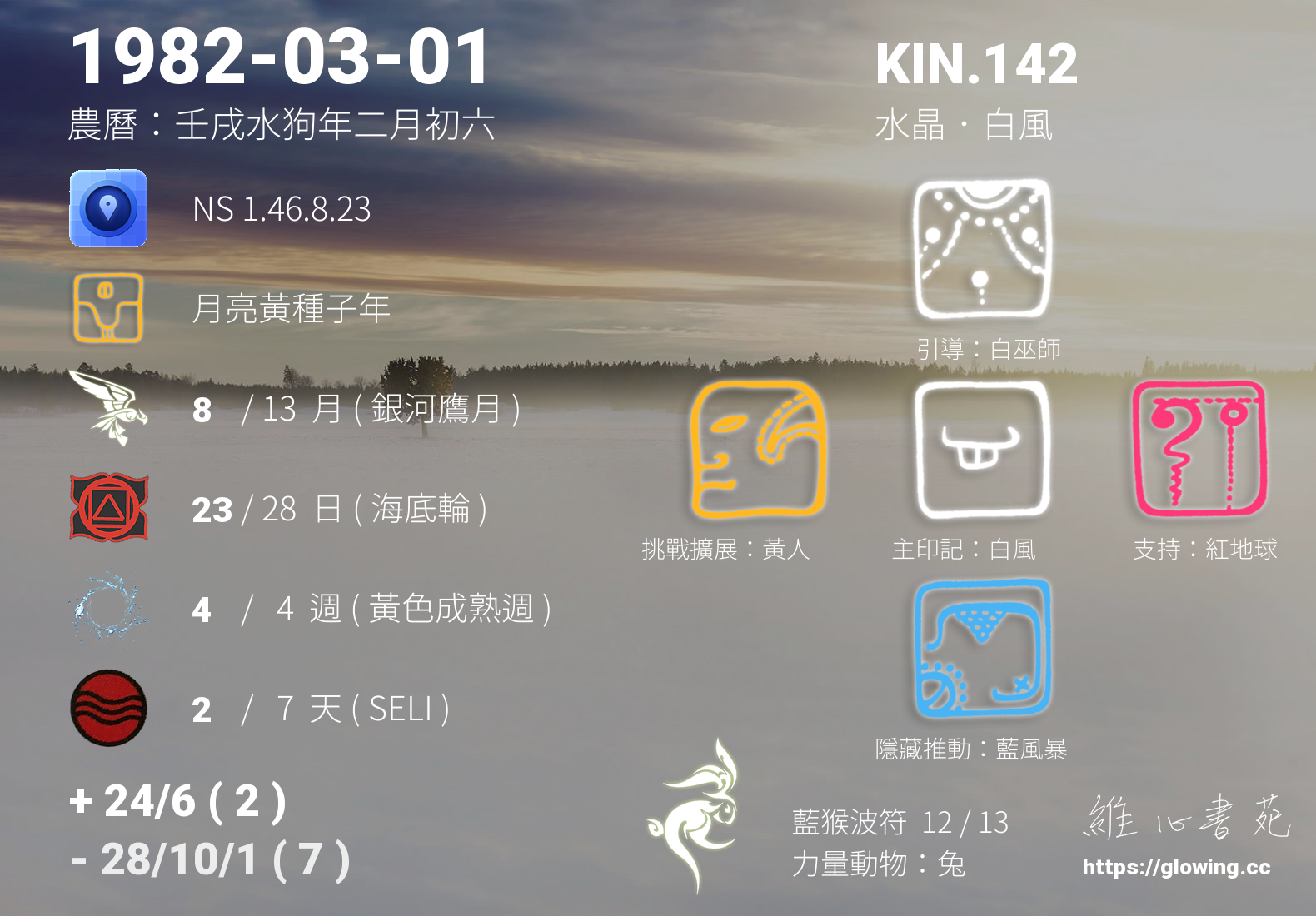白風的引導依據KIN的調性不同會有五種可能性,KIN.142的引導圖騰是白巫師 , 白巫師引導著我們看見自己的不安,因為不安,所以我們尋求解答,因為不安,所以我在現實外,尋找安心的方向與方式。