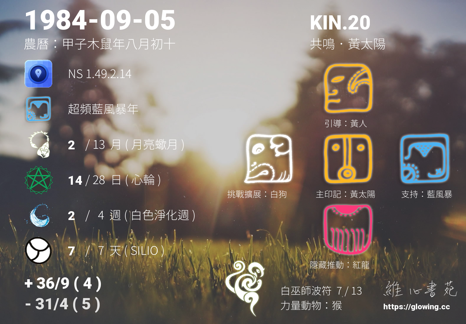 我們可以稱 KIN 20 為 【共鳴黃太陽】 、 【共鳴的黃太陽】 、 【白巫師波符 之 共鳴黃太陽】 也可以是 【共鳴黃太陽.白巫師波符】 ,你比較喜歡哪一個稱號呢?