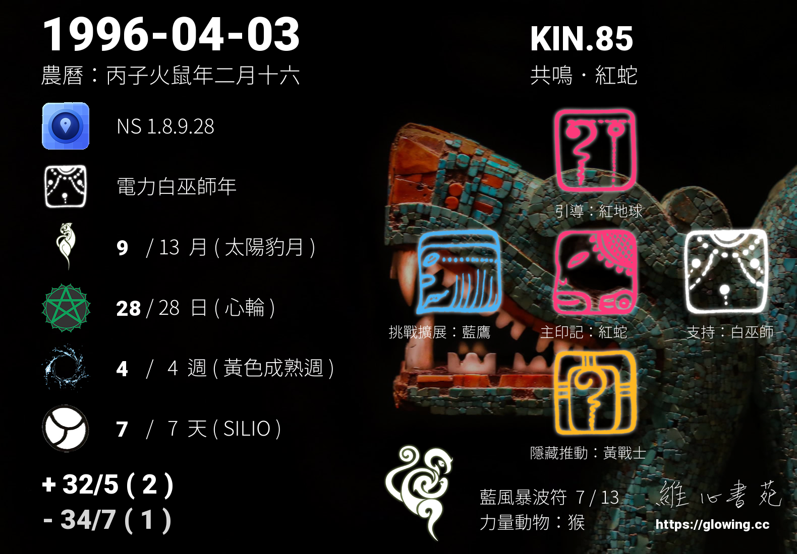 我們可以稱 KIN 85 為 【共鳴紅蛇】 、 【共鳴的紅蛇】 、 【藍風暴波符 之 共鳴紅蛇】 也可以是 【共鳴紅蛇.藍風暴波符】 ,你比較喜歡哪一個稱號呢?