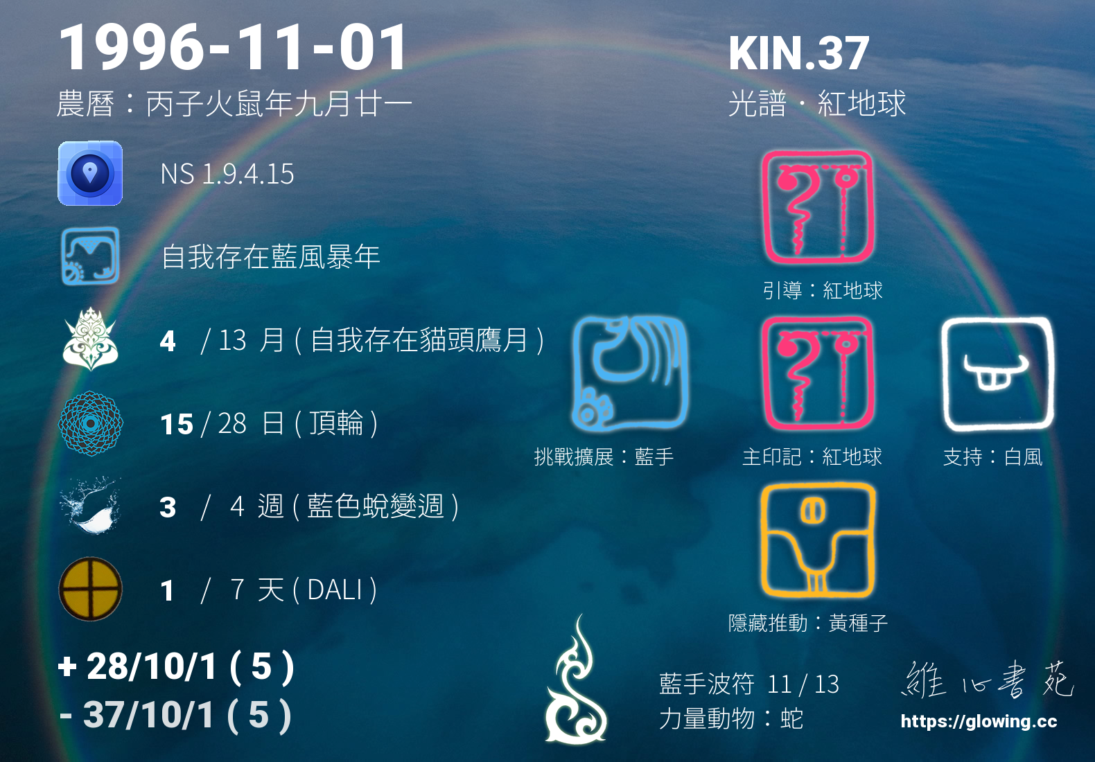 我們可以稱 KIN 37 為 【光譜紅地球】 、 【光譜的紅地球】 、 【藍手波符 之 光譜紅地球】 也可以是 【光譜紅地球.藍手波符】 ,你比較喜歡哪一個稱號呢?