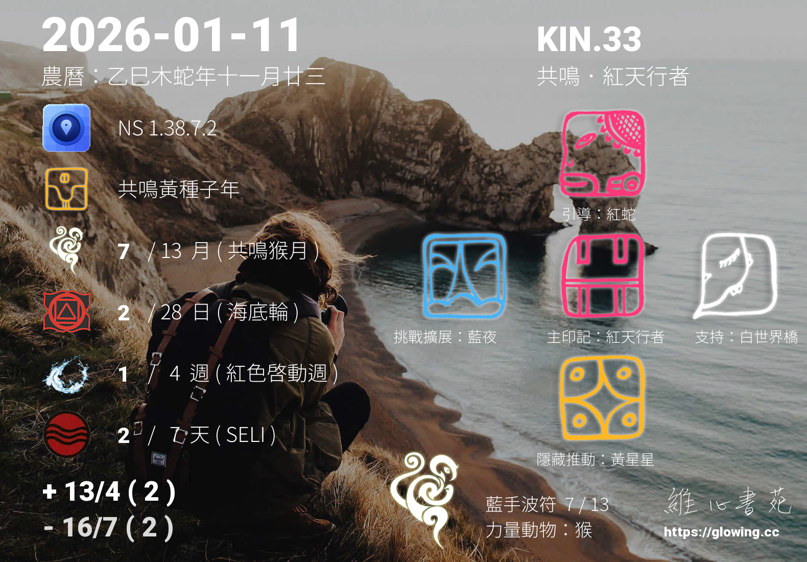 我們可以稱 KIN 33 為 【共鳴紅天行者】 、 【共鳴的紅天行者】 、 【藍手波符 之 共鳴紅天行者】 也可以是 【共鳴紅天行者.藍手波符】 ,你比較喜歡哪一個稱號呢?