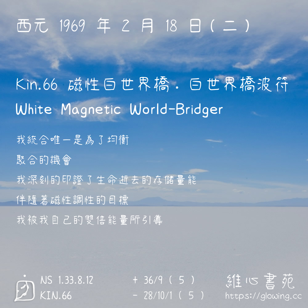 我們可以稱 KIN 66 為 【磁性白世界橋】 、 【磁性的白世界橋】 、 【白世界橋波符 之 磁性白世界橋】 也可以是 【磁性白世界橋.白世界橋波符】 ,你比較喜歡哪一個稱號呢?