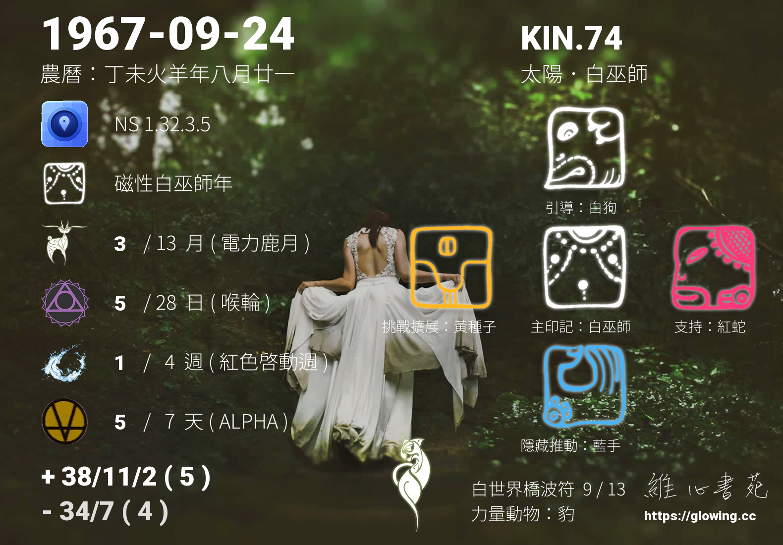 白巫師的引導依據KIN的調性不同會有五種可能性,KIN.74的引導圖騰是白狗 , 沒有白狗的引導,我們沒有辦法體會到具象的愛,真實的能量流動,需要伴隨著具象的行為模式,白狗的愛相當的純粹、自然且生動現實,我們可以全然的接受,那發自內心毫無一絲污漬的潔淨純白。