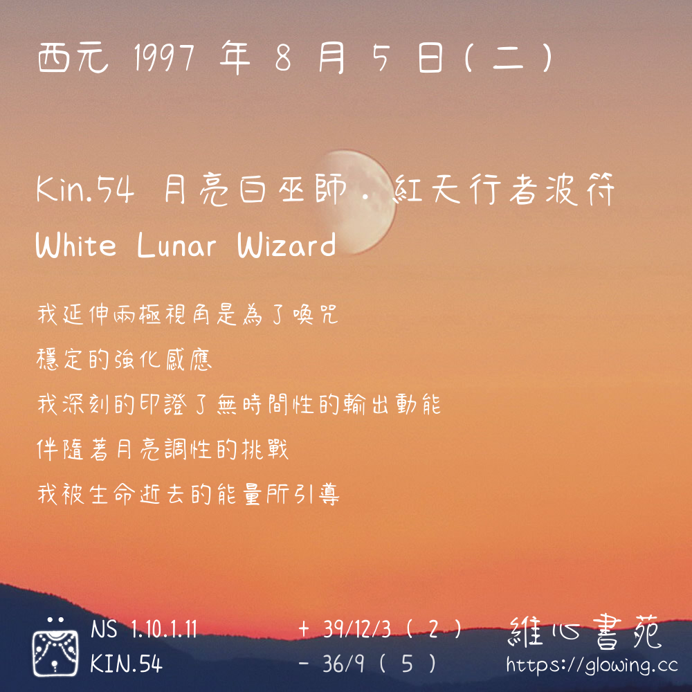 我們可以稱 KIN 54 為 【月亮白巫師】 、 【月亮的白巫師】 、 【紅天行者波符 之 月亮白巫師】 也可以是 【月亮白巫師.紅天行者波符】 ,你比較喜歡哪一個稱號呢?