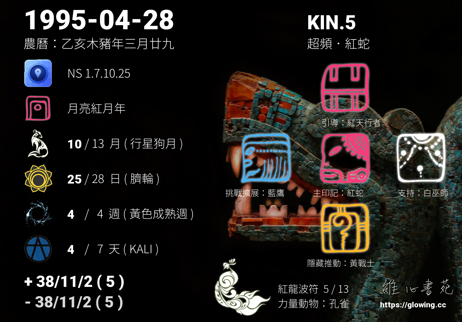 KIN.5 位於 紅龍波符 13 天中的第 5 天,銀河音階為調性 5