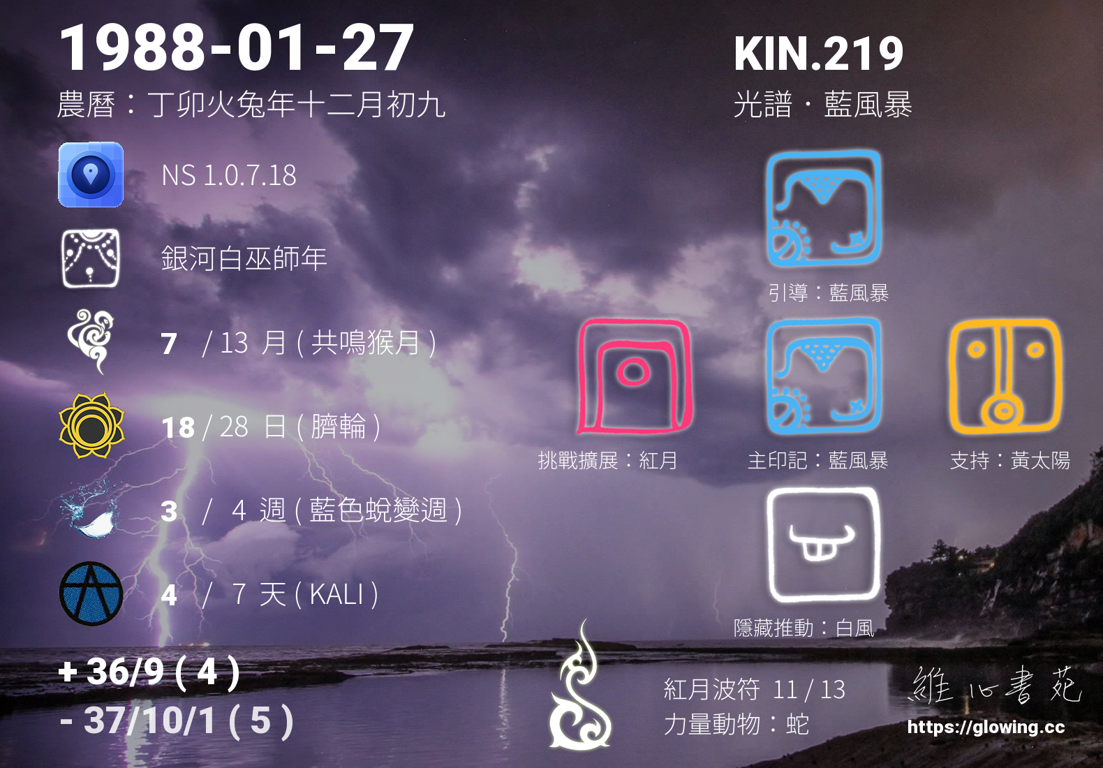 我們可以稱 KIN 219 為 【光譜藍風暴】 、 【光譜的藍風暴】 、 【紅月波符 之 光譜藍風暴】 也可以是 【光譜藍風暴.紅月波符】 ,你比較喜歡哪一個稱號呢?