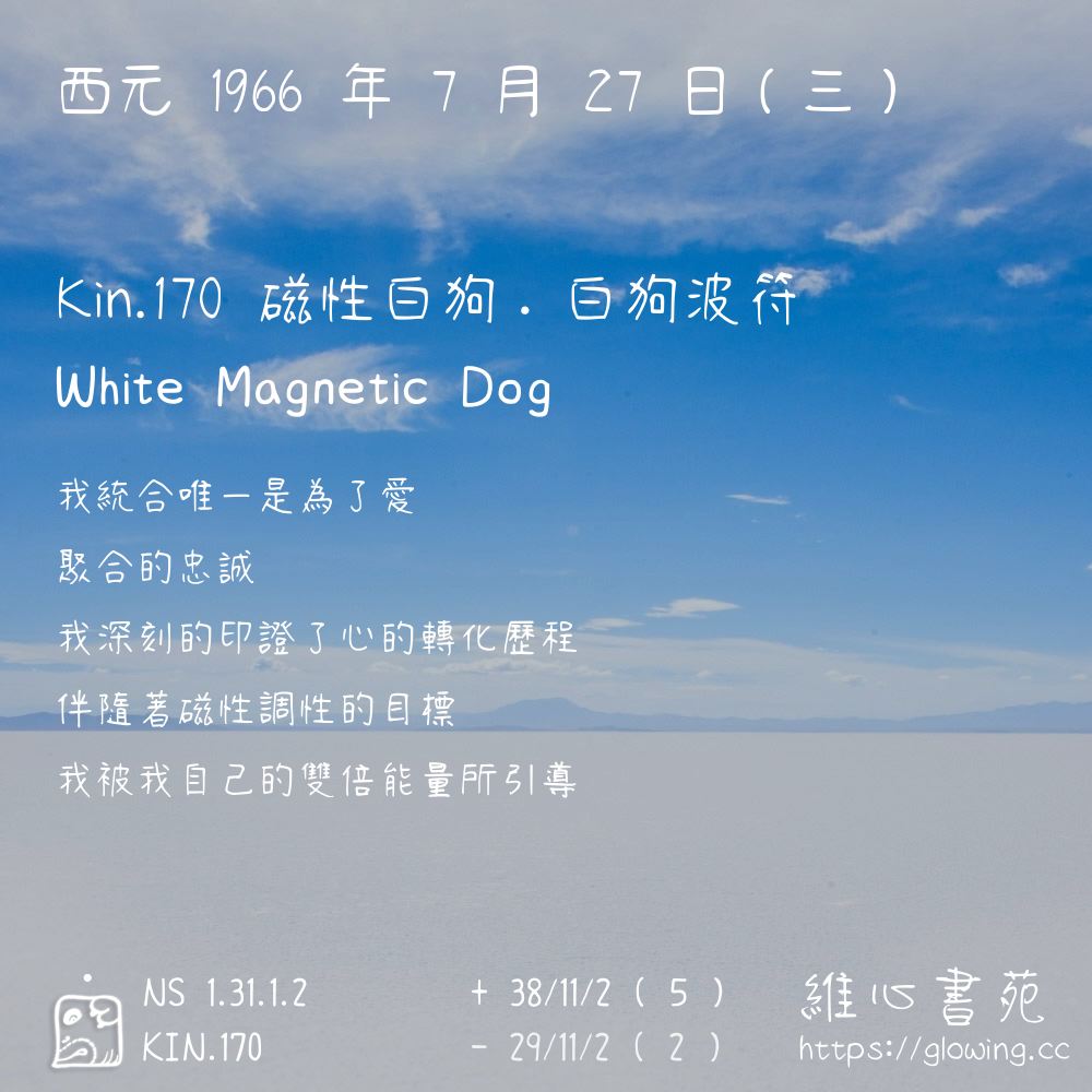 我們可以稱 KIN 170 為 【磁性白狗】 、 【磁性的白狗】 、 【白狗波符 之 磁性白狗】 也可以是 【磁性白狗.白狗波符】 ,你比較喜歡哪一個稱號呢?