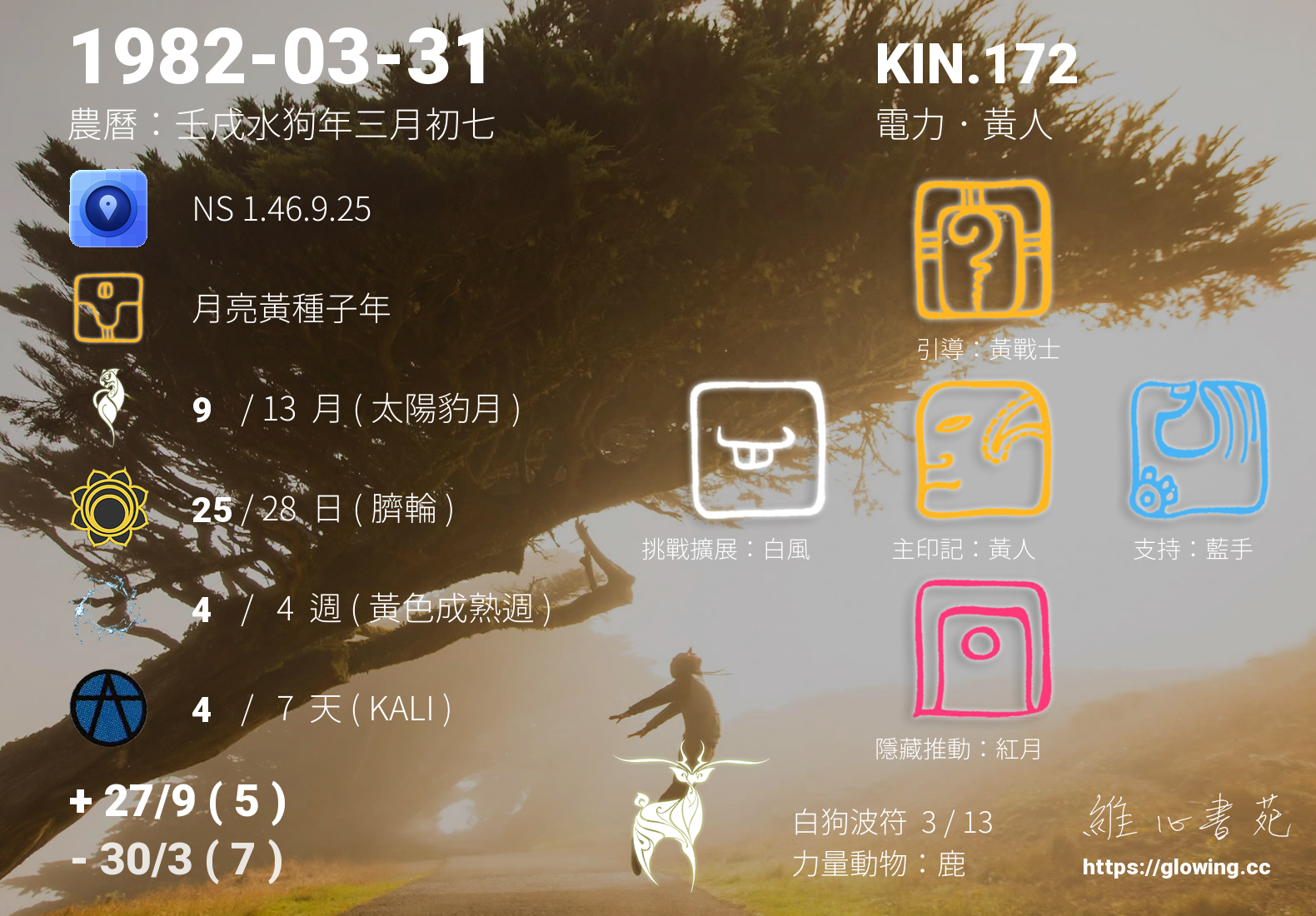 黃人的引導依據KIN的調性不同會有五種可能性,KIN.172的引導圖騰是黃戰士 , 黃戰士引導著我們勇敢無懼地去實現夢想,所有的夢想都需要時間去成就,在一步步的突破中我們需要無比的勇氣,黃戰士的無畏提供我們滋糧,讓我們堅實挺立不畏風霜,終將取得豐碩的成果。