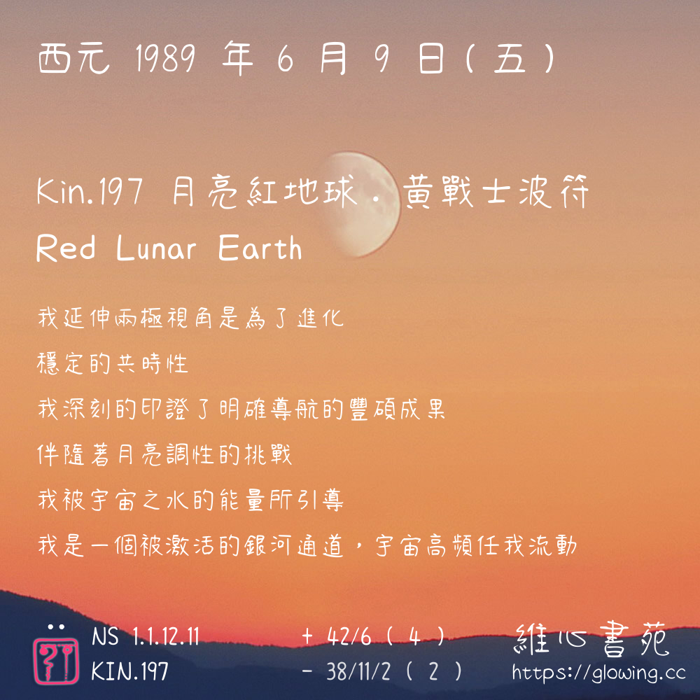 我們可以稱 KIN 197 為 【月亮紅地球】 、 【月亮的紅地球】 、 【黃戰士波符 之 月亮紅地球】 也可以是 【月亮紅地球.黃戰士波符】 ,你比較喜歡哪一個稱號呢?