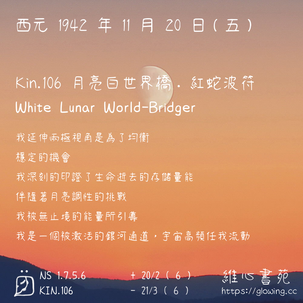 我們可以稱 KIN 106 為 【月亮白世界橋】 、 【月亮的白世界橋】 、 【紅蛇波符 之 月亮白世界橋】 也可以是 【月亮白世界橋.紅蛇波符】 ,你比較喜歡哪一個稱號呢?