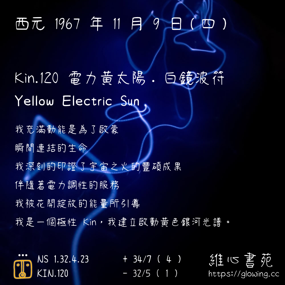 我們可以稱 KIN 120 為 【電力黃太陽】 、 【電力的黃太陽】 、 【白鏡波符 之 電力黃太陽】 也可以是 【電力黃太陽.白鏡波符】 ,你比較喜歡哪一個稱號呢?