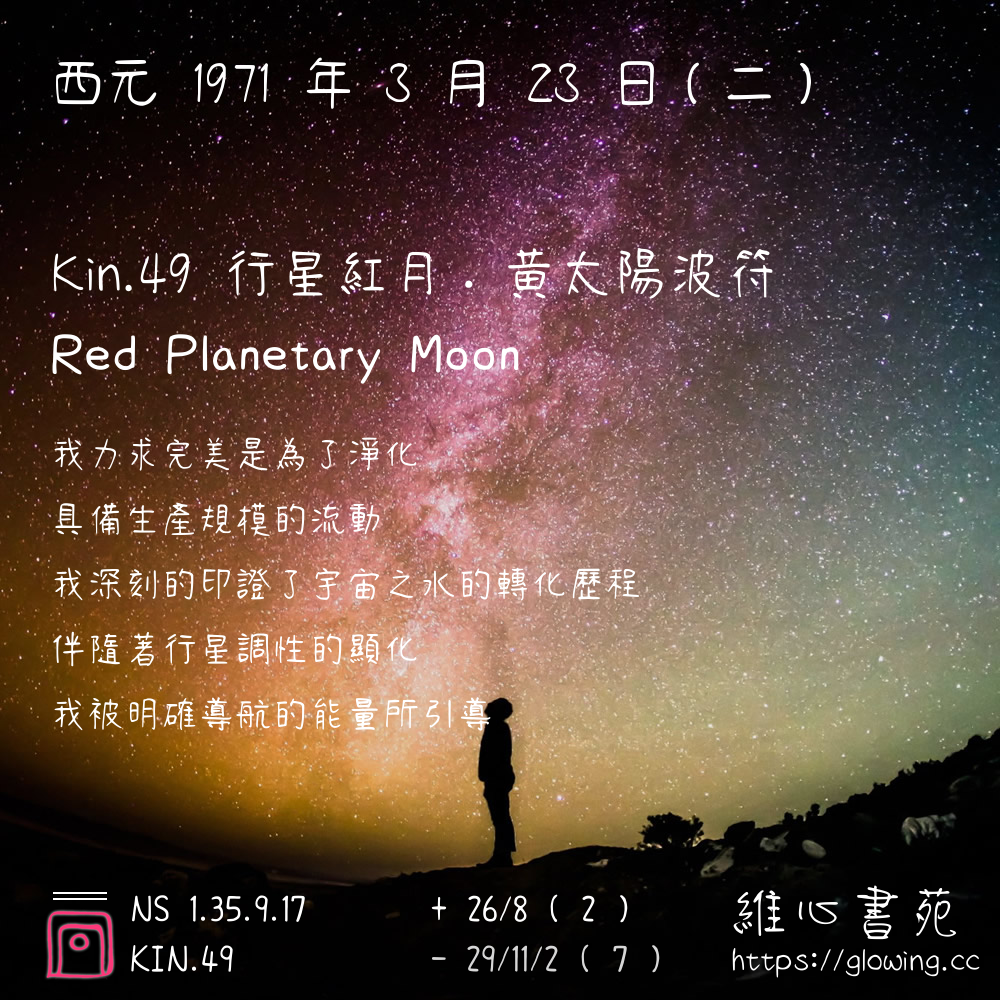 我們可以稱 KIN 49 為 【行星紅月】 、 【行星的紅月】 、 【黃太陽波符 之 行星紅月】 也可以是 【行星紅月.黃太陽波符】 ,你比較喜歡哪一個稱號呢?