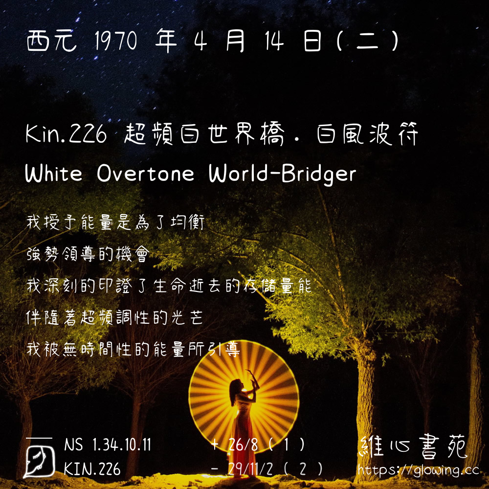我們可以稱 KIN 226 為 【超頻白世界橋】 、 【超頻的白世界橋】 、 【白風波符 之 超頻白世界橋】 也可以是 【超頻白世界橋.白風波符】 ,你比較喜歡哪一個稱號呢?