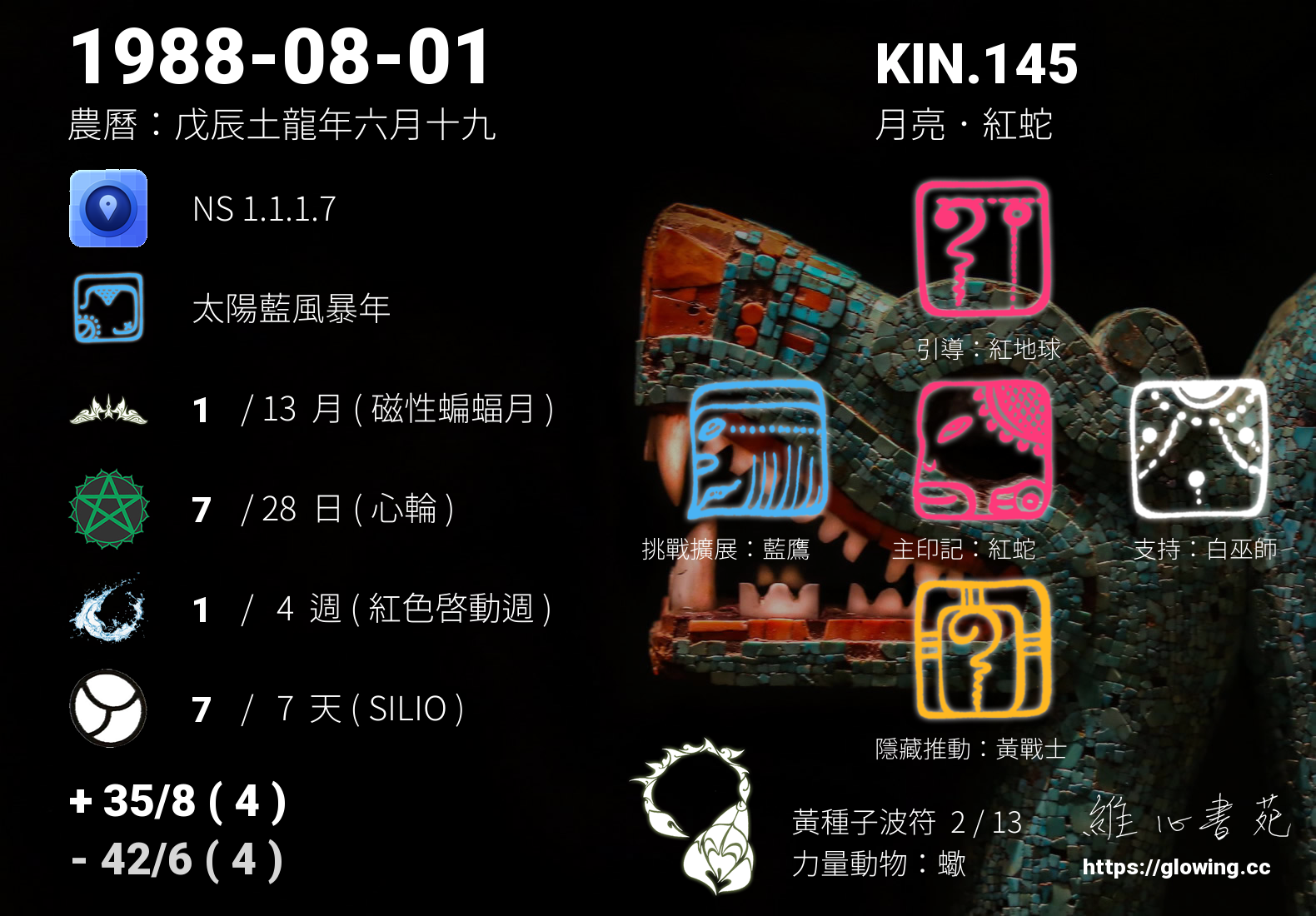 我們可以稱 KIN 145 為 【月亮紅蛇】 、 【月亮的紅蛇】 、 【黃種子波符 之 月亮紅蛇】 也可以是 【月亮紅蛇.黃種子波符】 ,你比較喜歡哪一個稱號呢?