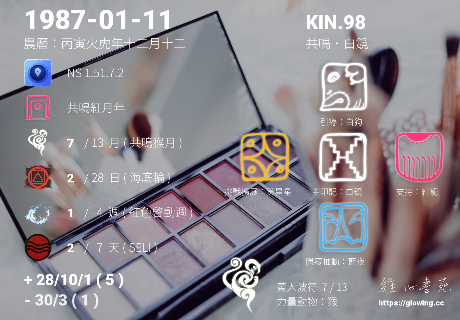 我們可以稱 KIN 98 為 【共鳴白鏡】 、 【共鳴的白鏡】 、 【黃人波符 之 共鳴白鏡】 也可以是 【共鳴白鏡.黃人波符】 ,你比較喜歡哪一個稱號呢?