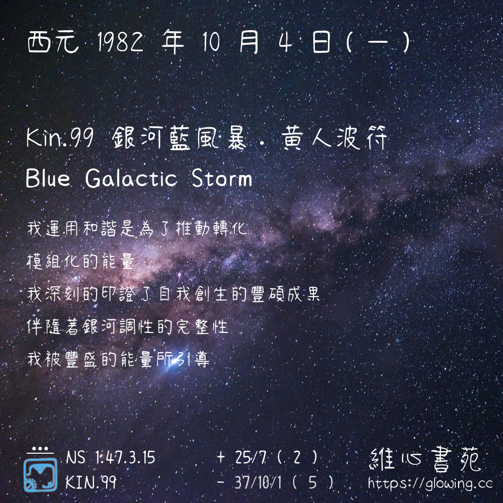 我們可以稱 KIN 99 為 【銀河藍風暴】 、 【銀河的藍風暴】 、 【黃人波符 之 銀河藍風暴】 也可以是 【銀河藍風暴.黃人波符】 ,你比較喜歡哪一個稱號呢?