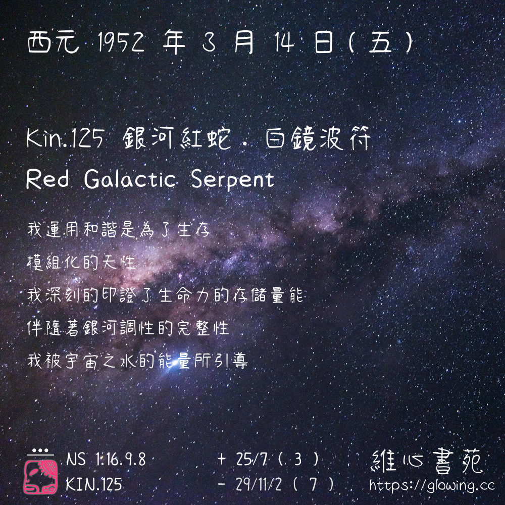 我們可以稱 KIN 125 為 【銀河紅蛇】 、 【銀河的紅蛇】 、 【白鏡波符 之 銀河紅蛇】 也可以是 【銀河紅蛇.白鏡波符】 ,你比較喜歡哪一個稱號呢?