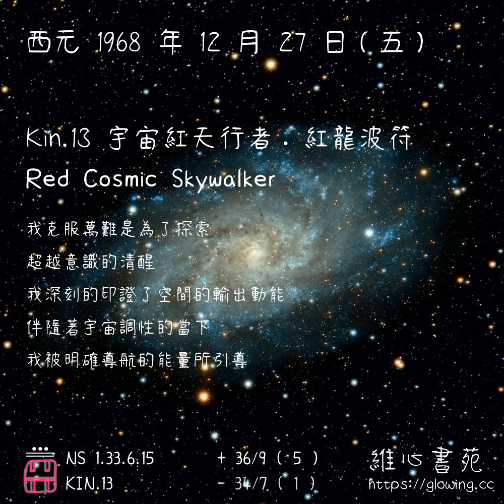 我們可以稱 KIN 13 為 【宇宙紅天行者】 、 【宇宙的紅天行者】 、 【紅龍波符 之 宇宙紅天行者】 也可以是 【宇宙紅天行者.紅龍波符】 ,你比較喜歡哪一個稱號呢?