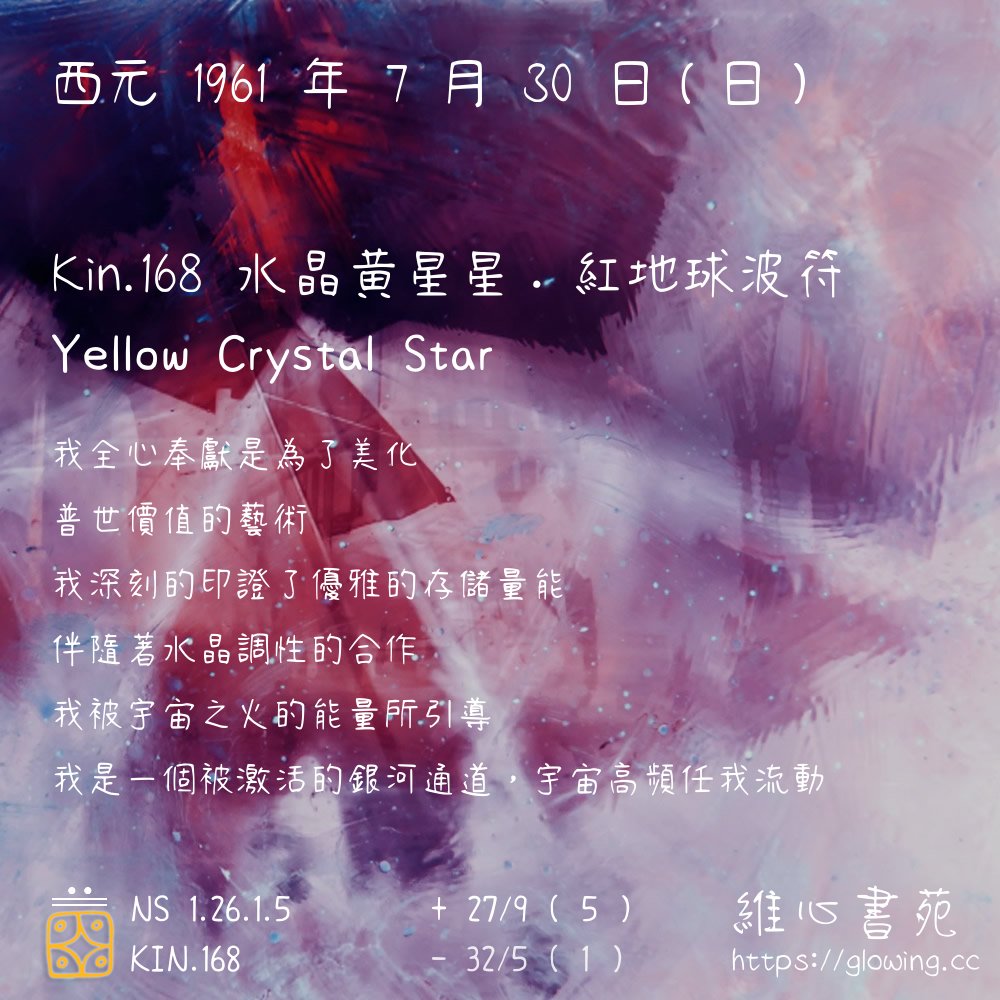 我們可以稱 KIN 168 為 【水晶黃星星】 、 【水晶的黃星星】 、 【紅地球波符 之 水晶黃星星】 也可以是 【水晶黃星星.紅地球波符】 ,你比較喜歡哪一個稱號呢?