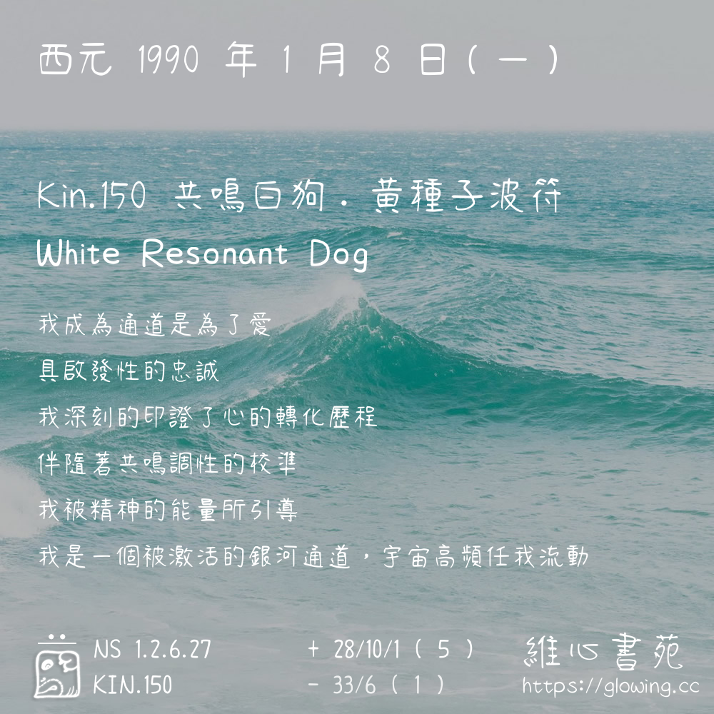 我們可以稱 KIN 150 為 【共鳴白狗】 、 【共鳴的白狗】 、 【黃種子波符 之 共鳴白狗】 也可以是 【共鳴白狗.黃種子波符】 ,你比較喜歡哪一個稱號呢?