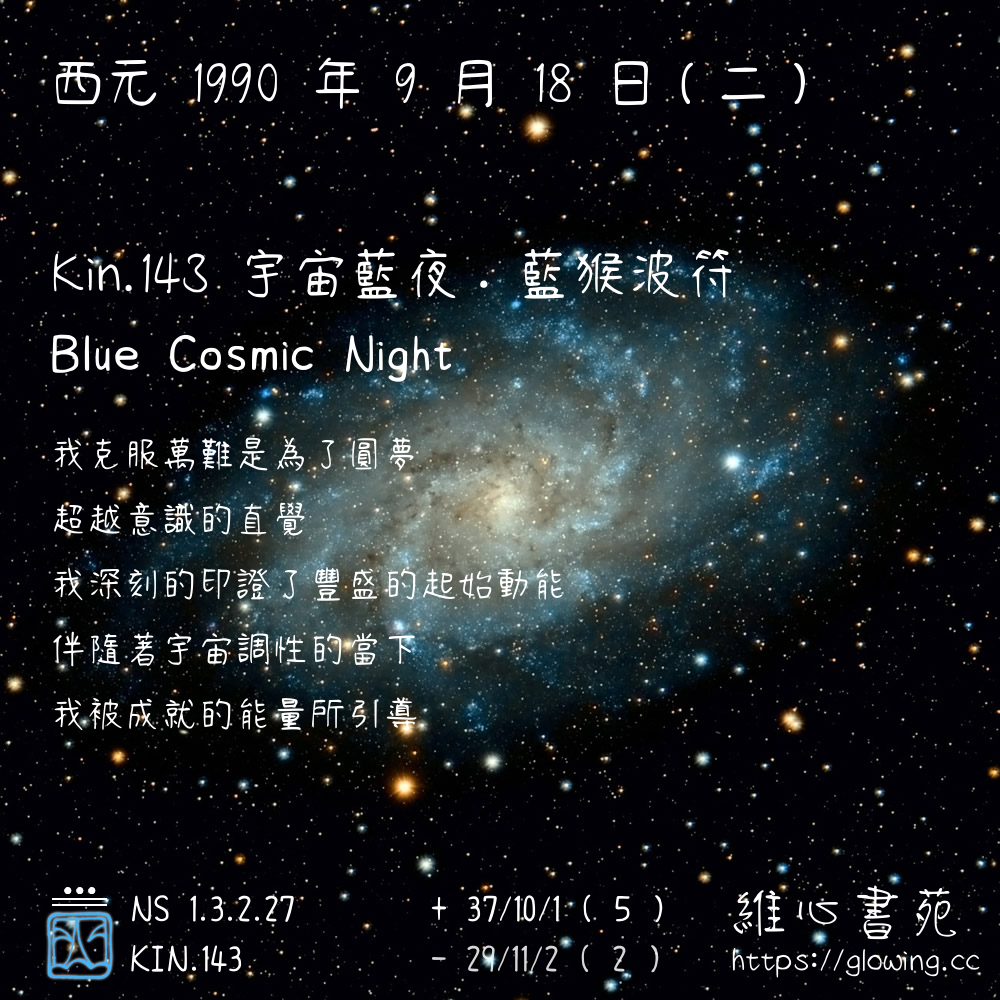 我們可以稱 KIN 143 為 【宇宙藍夜】 、 【宇宙的藍夜】 、 【藍猴波符 之 宇宙藍夜】 也可以是 【宇宙藍夜.藍猴波符】 ,你比較喜歡哪一個稱號呢?