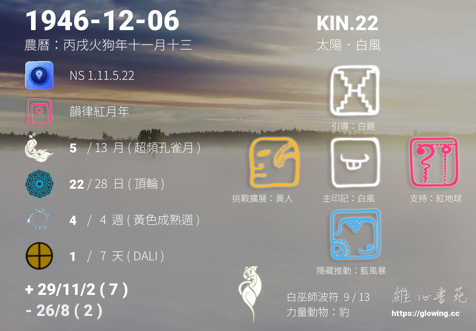 白風的引導依據KIN的調性不同會有五種可能性,KIN.22的引導圖騰是白鏡 , 白鏡引導著我們認清自我,為我們的未來留下紀錄,將我們每一個思緒紀錄在天體運行中,在我們回歸的那個當下,迴向各所有的存在與眾生,為這個世界留下美麗色彩。