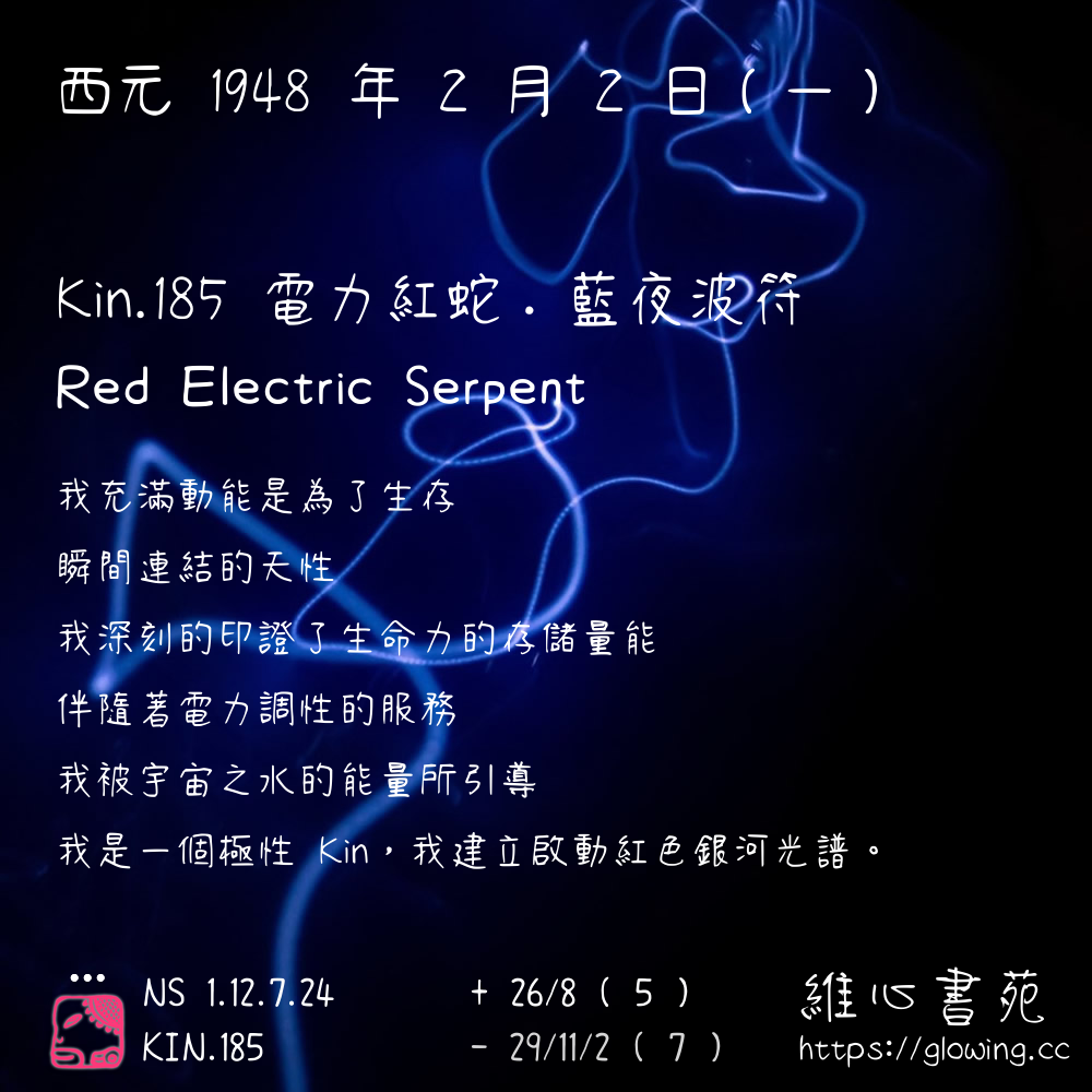 我們可以稱 KIN 185 為 【電力紅蛇】 、 【電力的紅蛇】 、 【藍夜波符 之 電力紅蛇】 也可以是 【電力紅蛇.藍夜波符】 ,你比較喜歡哪一個稱號呢?