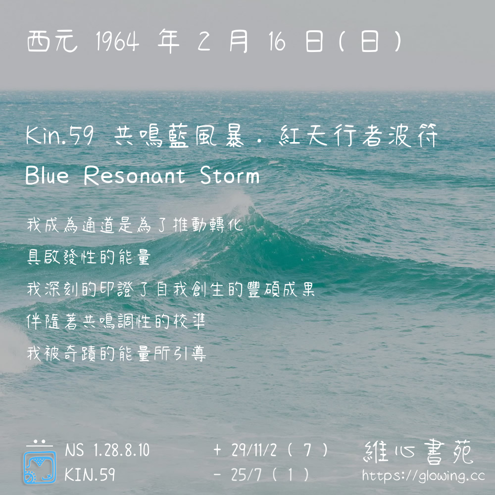 我們可以稱 KIN 59 為 【共鳴藍風暴】 、 【共鳴的藍風暴】 、 【紅天行者波符 之 共鳴藍風暴】 也可以是 【共鳴藍風暴.紅天行者波符】 ,你比較喜歡哪一個稱號呢?