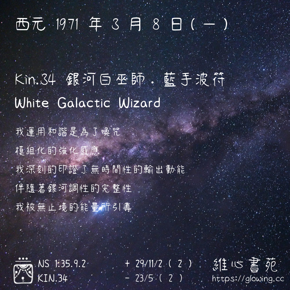 我們可以稱 KIN 34 為 【銀河白巫師】 、 【銀河的白巫師】 、 【藍手波符 之 銀河白巫師】 也可以是 【銀河白巫師.藍手波符】 ,你比較喜歡哪一個稱號呢?