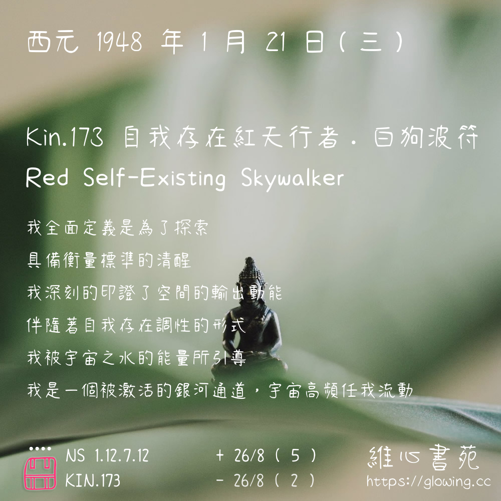 我們可以稱 KIN 173 為 【自我存在紅天行者】 、 【自我存在的紅天行者】 、 【白狗波符 之 自我存在紅天行者】 也可以是 【自我存在紅天行者.白狗波符】 ,你比較喜歡哪一個稱號呢?