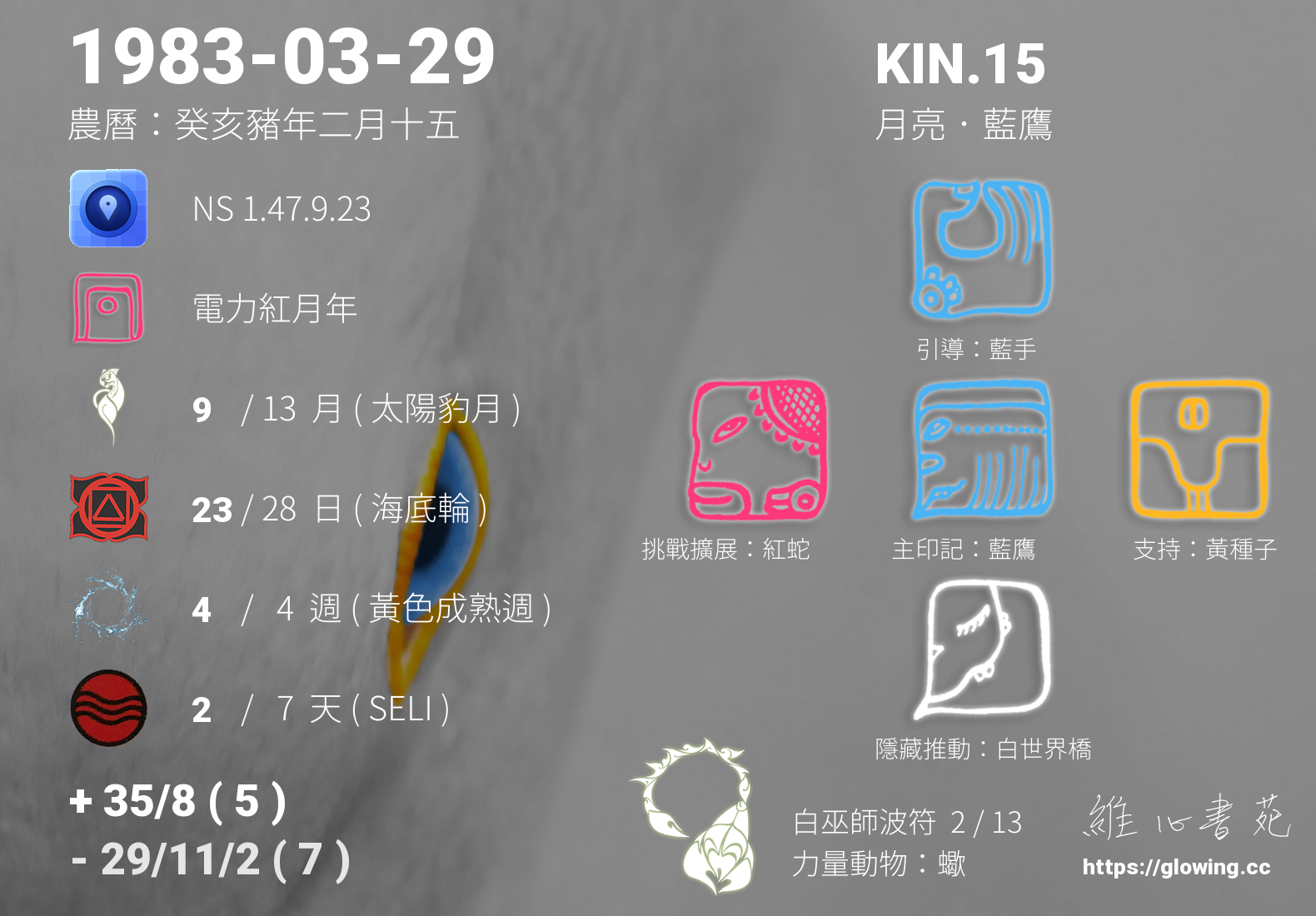 我們可以稱 KIN 15 為 【月亮藍鷹】 、 【月亮的藍鷹】 、 【白巫師波符 之 月亮藍鷹】 也可以是 【月亮藍鷹.白巫師波符】 ,你比較喜歡哪一個稱號呢?
