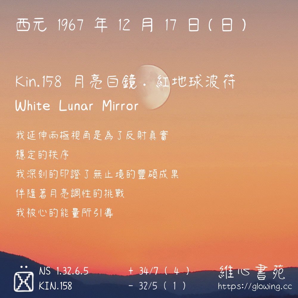 我們可以稱 KIN 158 為 【月亮白鏡】 、 【月亮的白鏡】 、 【紅地球波符 之 月亮白鏡】 也可以是 【月亮白鏡.紅地球波符】 ,你比較喜歡哪一個稱號呢?