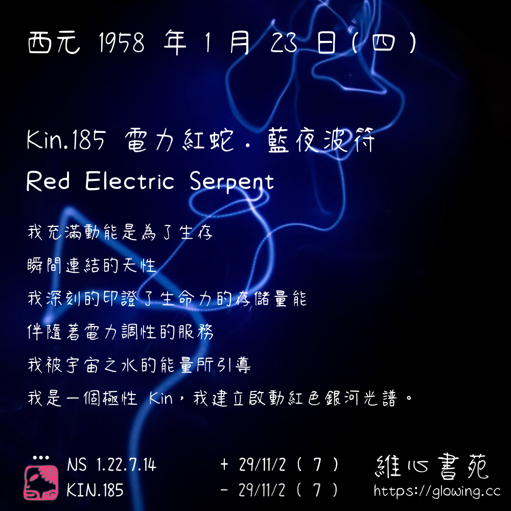 我們可以稱 KIN 185 為 【電力紅蛇】 、 【電力的紅蛇】 、 【藍夜波符 之 電力紅蛇】 也可以是 【電力紅蛇.藍夜波符】 ,你比較喜歡哪一個稱號呢?