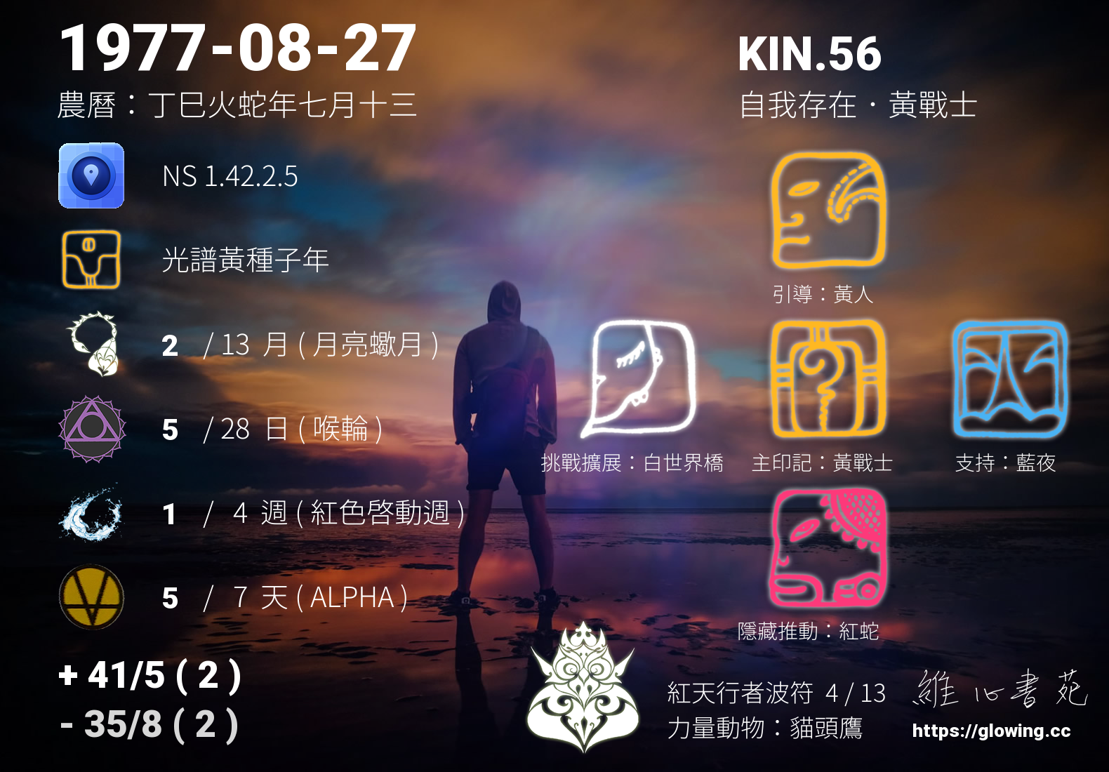 我們可以稱 KIN 56 為 【自我存在黃戰士】 、 【自我存在的黃戰士】 、 【紅天行者波符 之 自我存在黃戰士】 也可以是 【自我存在黃戰士.紅天行者波符】 ,你比較喜歡哪一個稱號呢?