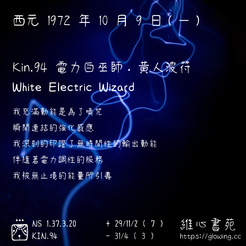 我們可以稱 KIN 94 為 【電力白巫師】 、 【電力的白巫師】 、 【黃人波符 之 電力白巫師】 也可以是 【電力白巫師.黃人波符】 ,你比較喜歡哪一個稱號呢?
