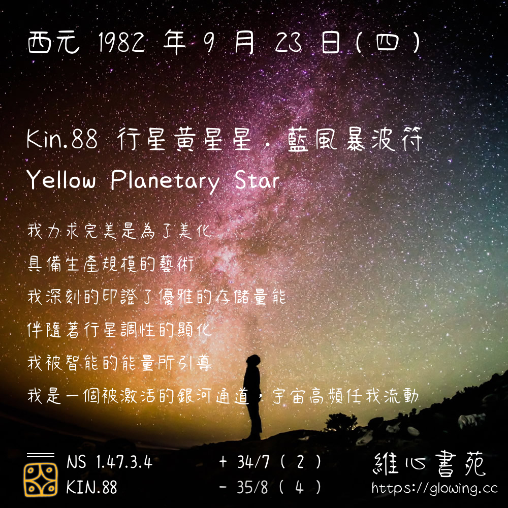 我們可以稱 KIN 88 為 【行星黃星星】 、 【行星的黃星星】 、 【藍風暴波符 之 行星黃星星】 也可以是 【行星黃星星.藍風暴波符】 ,你比較喜歡哪一個稱號呢?