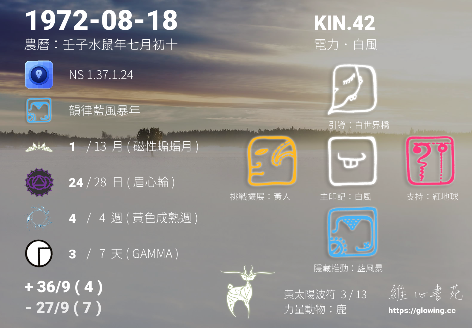 我們可以稱 KIN 42 為 【電力白風】 、 【電力的白風】 、 【黃太陽波符 之 電力白風】 也可以是 【電力白風.黃太陽波符】 ,你比較喜歡哪一個稱號呢?
