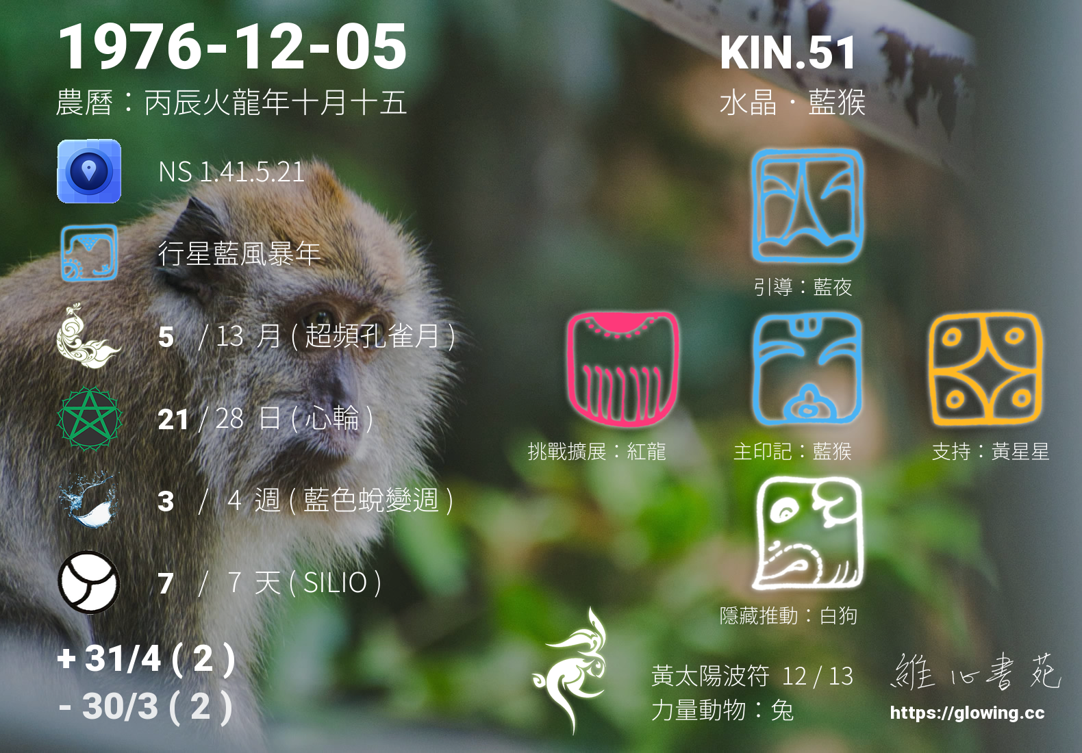我們可以稱 KIN 51 為 【水晶藍猴】 、 【水晶的藍猴】 、 【黃太陽波符 之 水晶藍猴】 也可以是 【水晶藍猴.黃太陽波符】 ,你比較喜歡哪一個稱號呢?