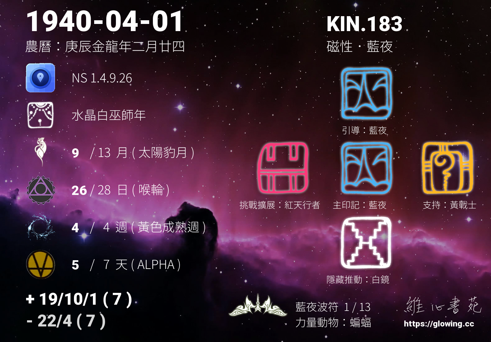 今天的星際原型圖騰為藍夜,我們稱之為主印記, 藍夜是夢想家的原型,有將夢想成真的天賦,直覺力強,在實踐夢想的過程中樂於分享將能更享豐盛。