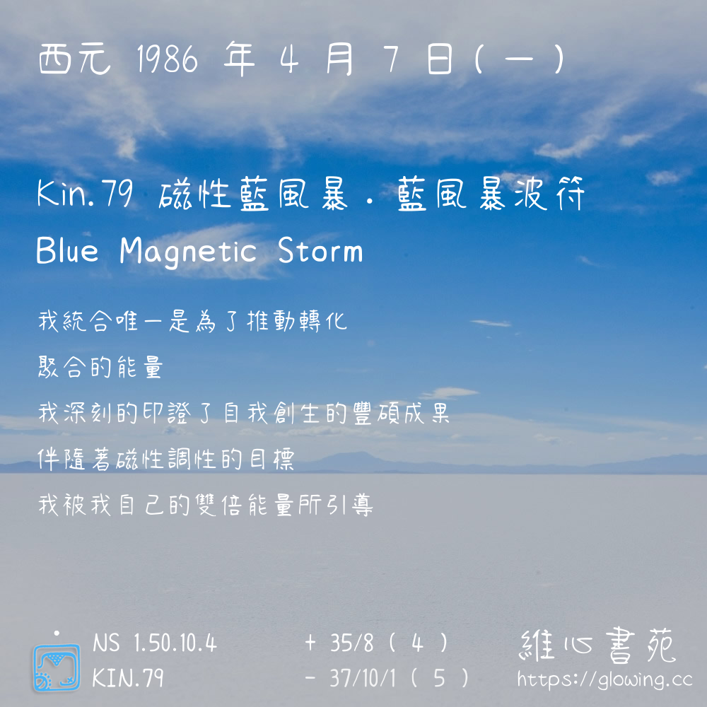 我們可以稱 KIN 79 為 【磁性藍風暴】 、 【磁性的藍風暴】 、 【藍風暴波符 之 磁性藍風暴】 也可以是 【磁性藍風暴.藍風暴波符】 ,你比較喜歡哪一個稱號呢?