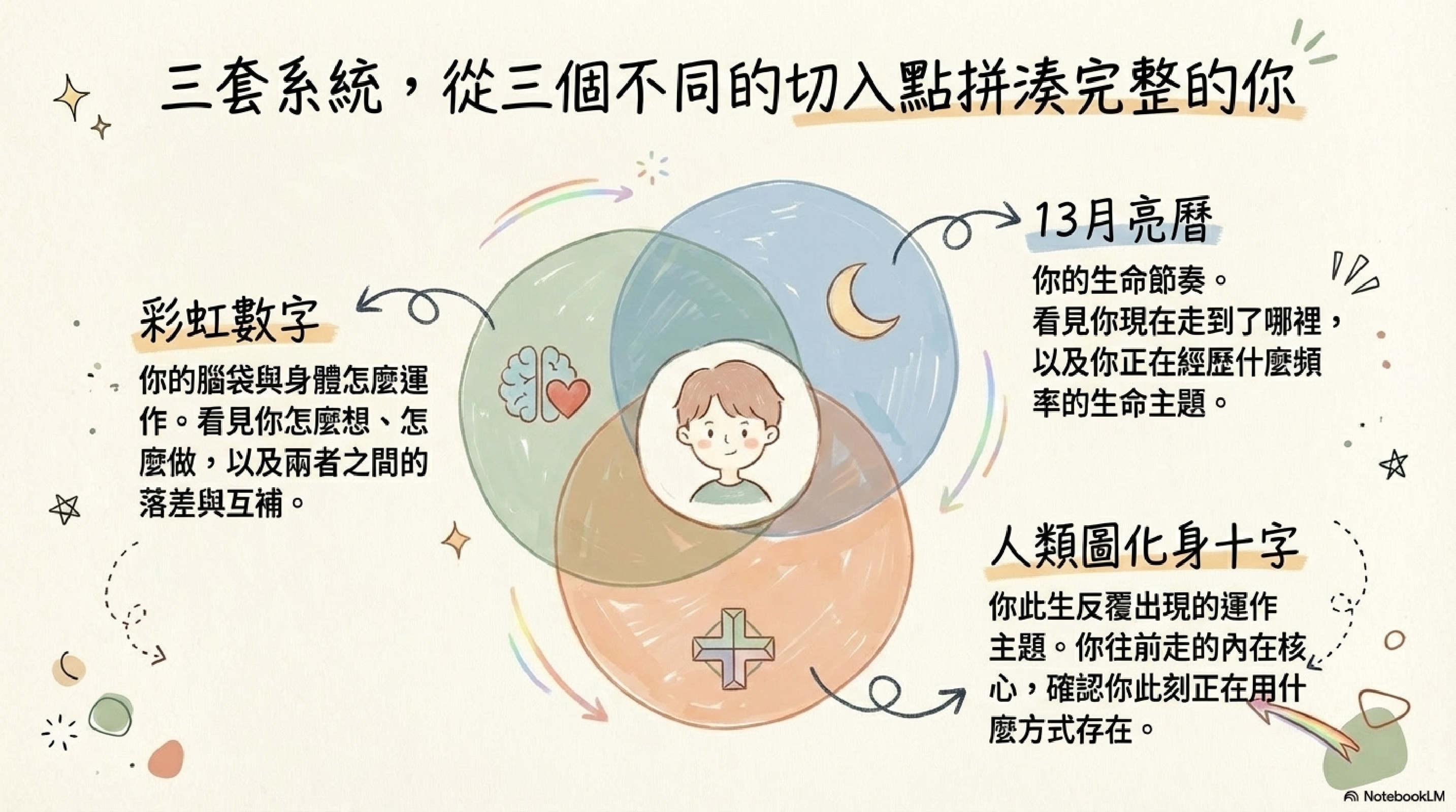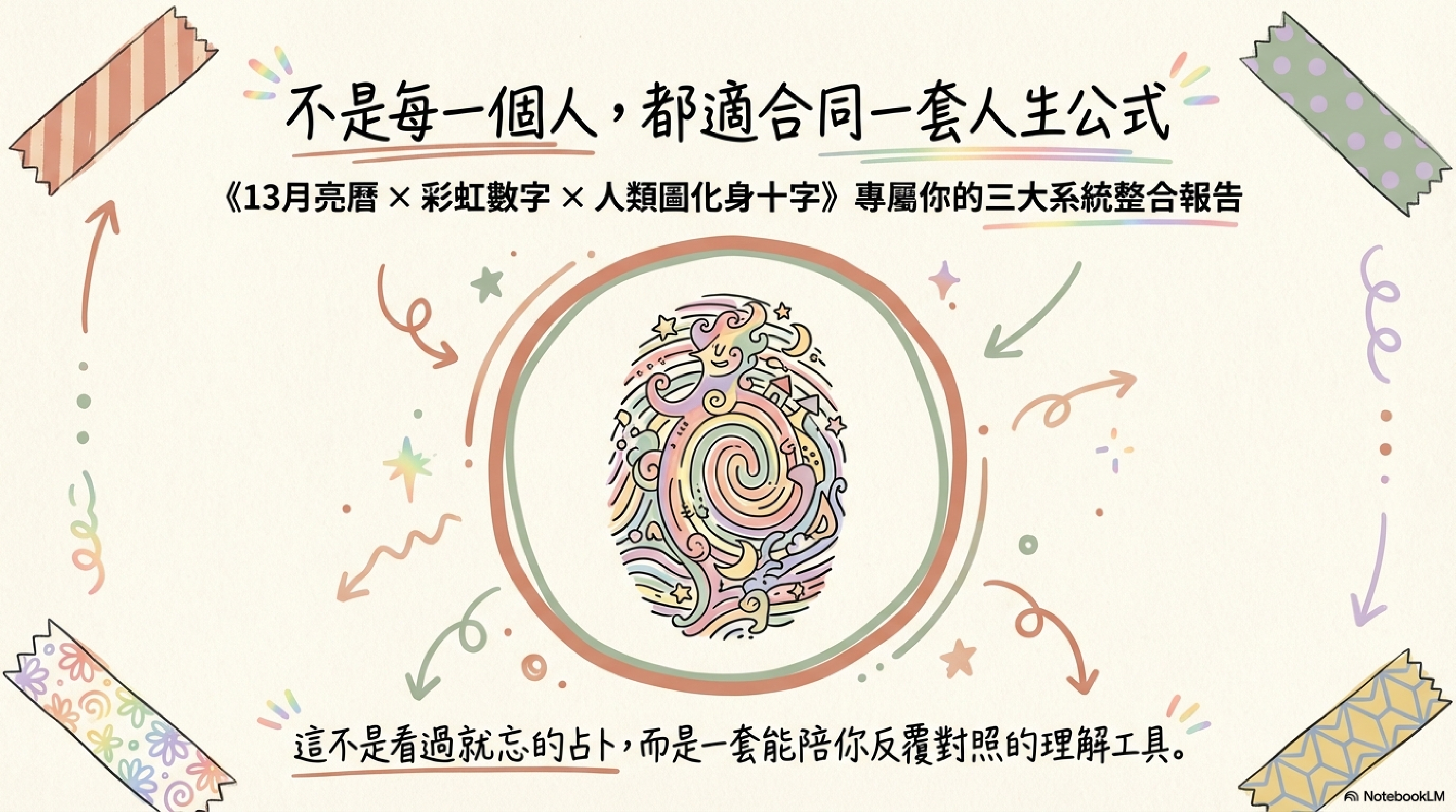 這次的三系統整合報告書,走的不是同一條路。它的重點不是把 Human Design 整張圖完整拆到底,而是把 Human Design、彩虹數字、13 月亮曆放在一起看,從三套系統的交叉對照裡,整理出一張更完整的生命藍圖。