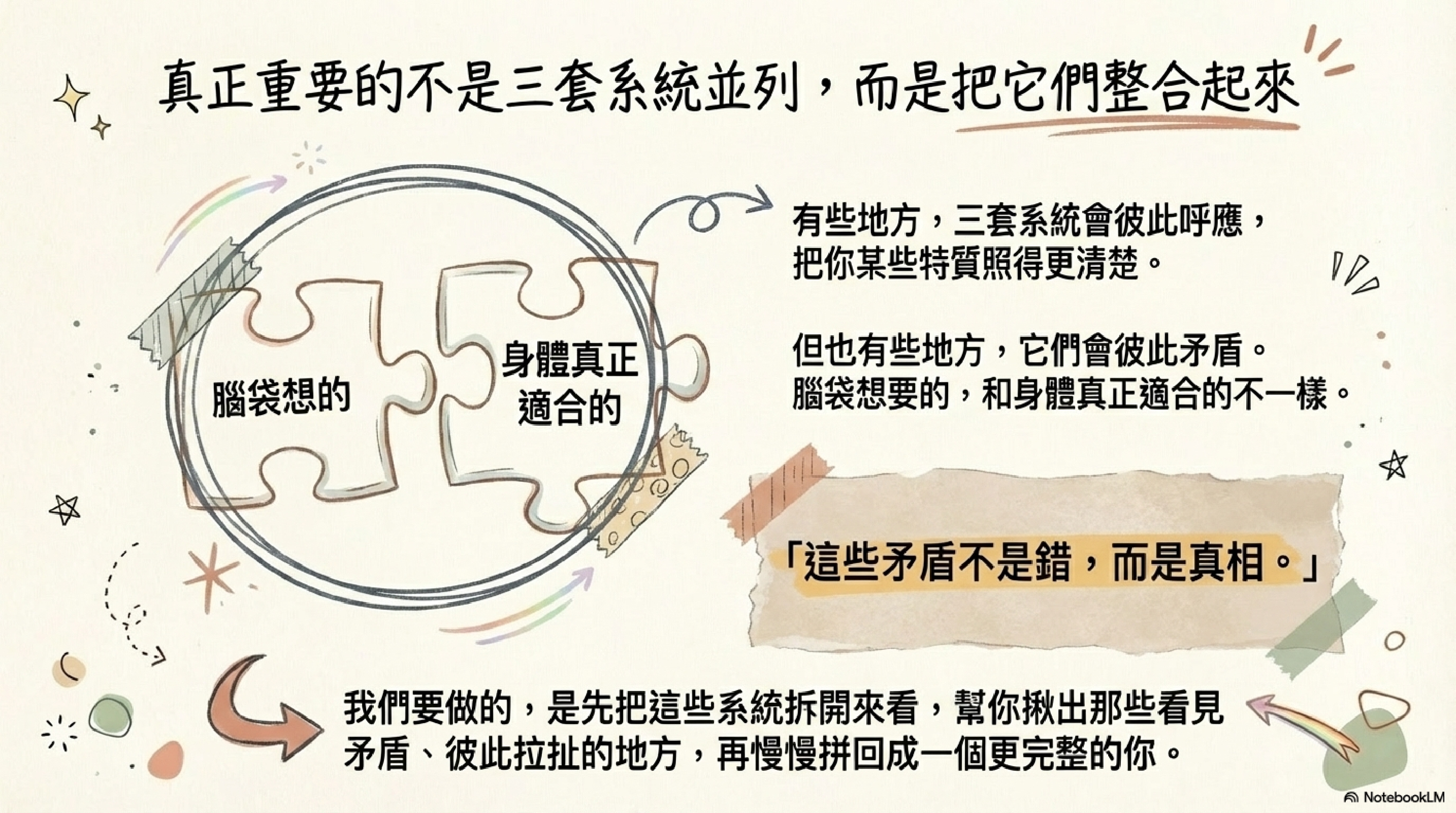 而是先分開看,再整合看。先看見不同層次各自怎麼運作,再慢慢拼回成一個更完整的你。