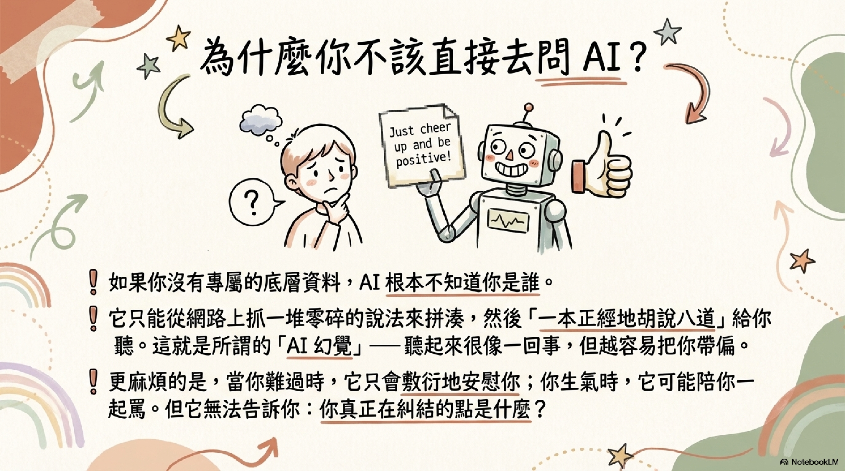 如果沒有你的底層資料,AI 根本不知道你是誰。它只能從網路上抓一堆零碎的說法東拼西湊,然後一本正經地講給你聽。聽起來很像那麼一回事,甚至還會用上一些專業術語——但那些話,有可能是錯的,有可能是別人的故事,也有可能只是它為了讓回答「看起來完整」而自己補出來的。這就是大家常說的「AI 幻覺」:它不是不懂,它是假裝懂;而且它假裝得越好,越容易把你帶偏。
