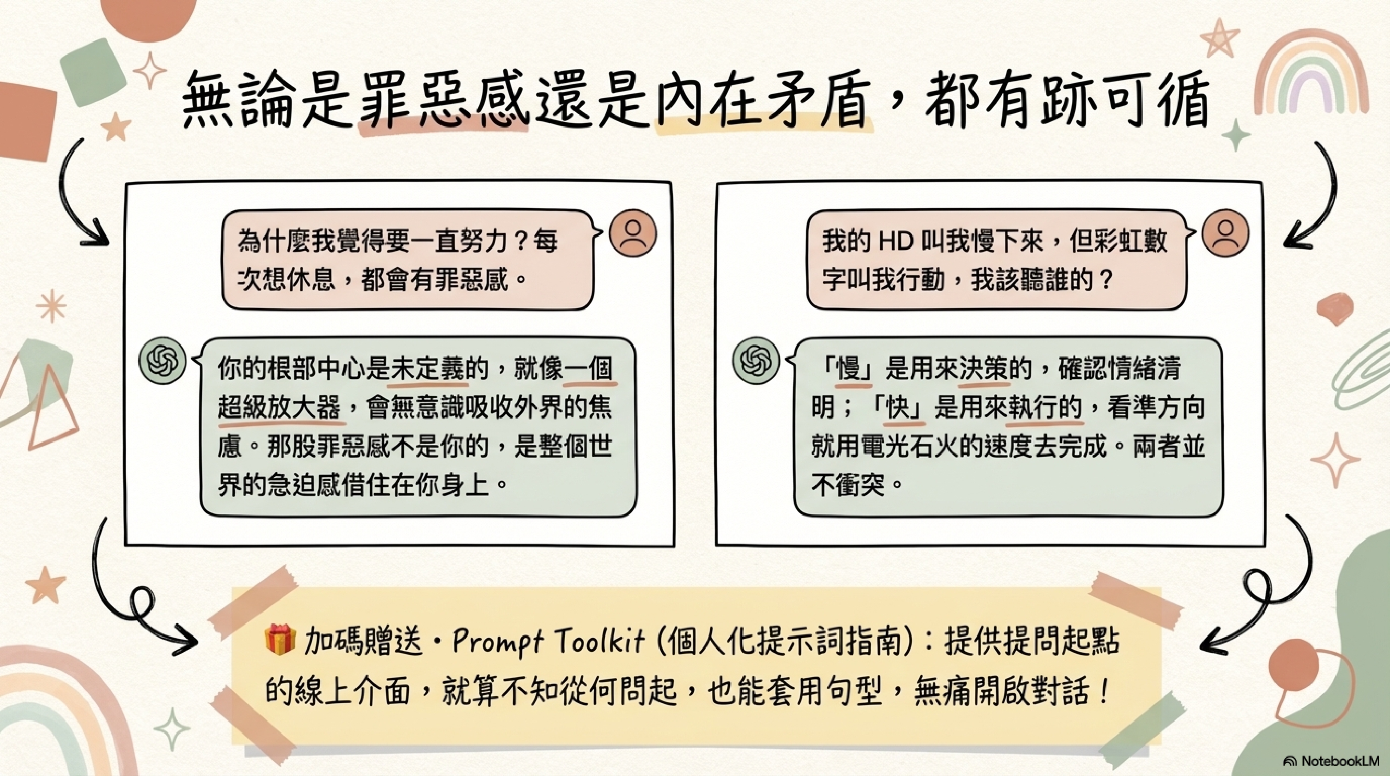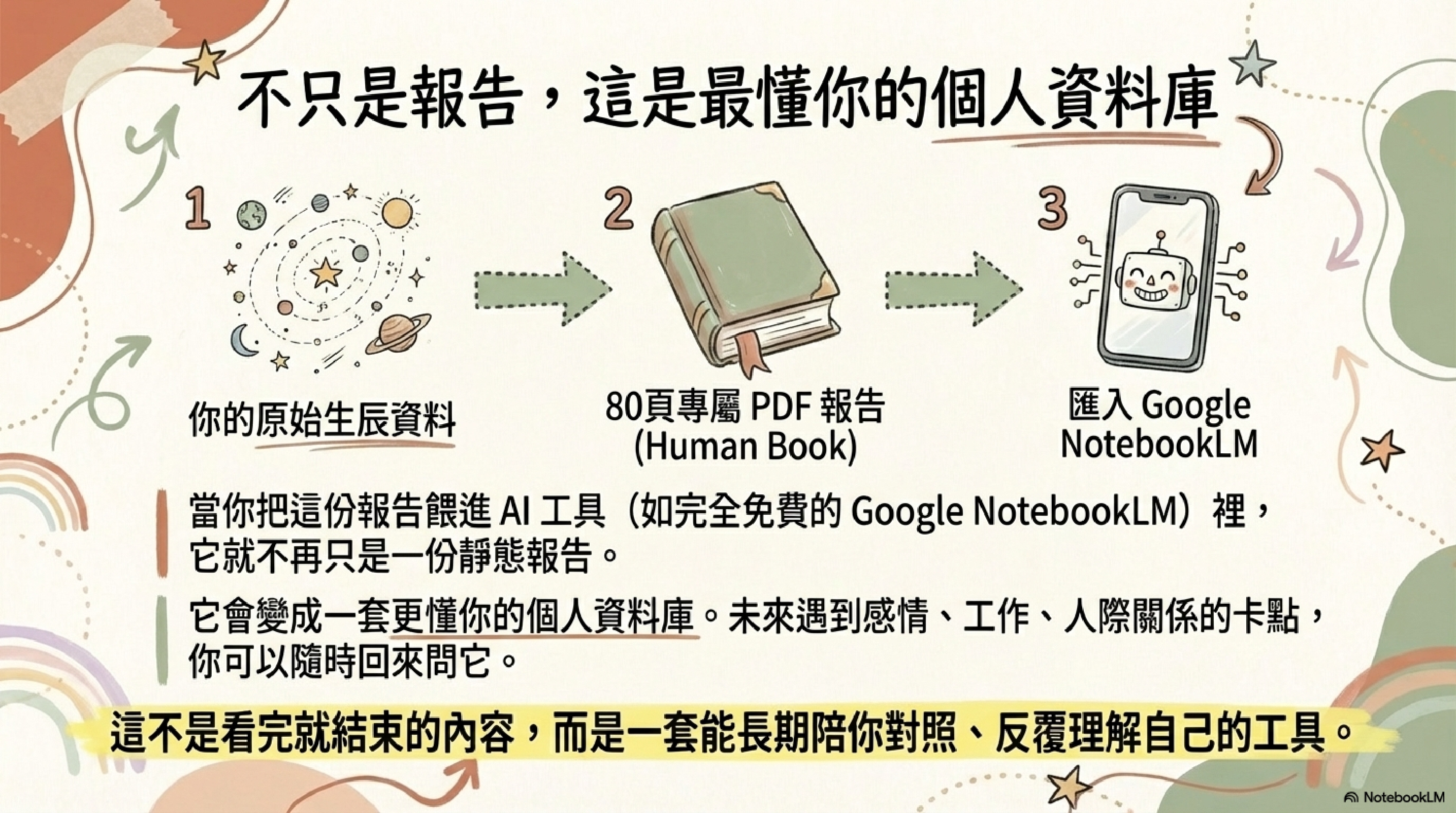 因為你買到的不是一份看完就結束的內容,而是一份可以反覆回來對照、使用、提問的個人資料庫。你可以直接閱讀,也可以放進 AI 工具裡,讓它在理解你的前提下陪你整理問題。無論是工作、關係、選擇,還是那些一直說不上來的內在卡點,它都不是只給你標準答案,而是從你出發。