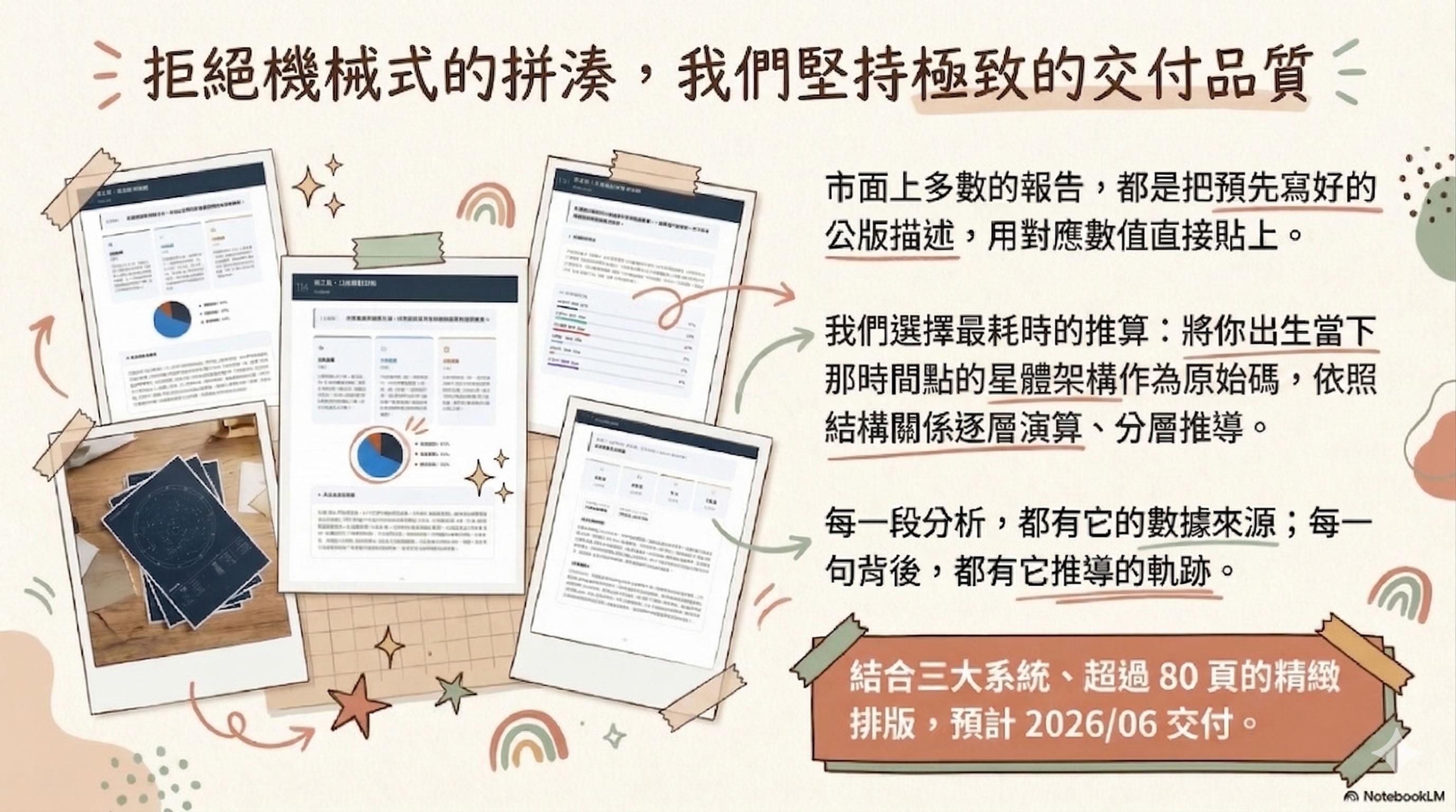 你會收到一份根據你出生資料訂製的 PDF 報告書,整合 13 月亮曆、彩虹數字、Human Design 化身十字 三套系統,共四個章節,超過 80 頁,預計於 2026/06 交付。