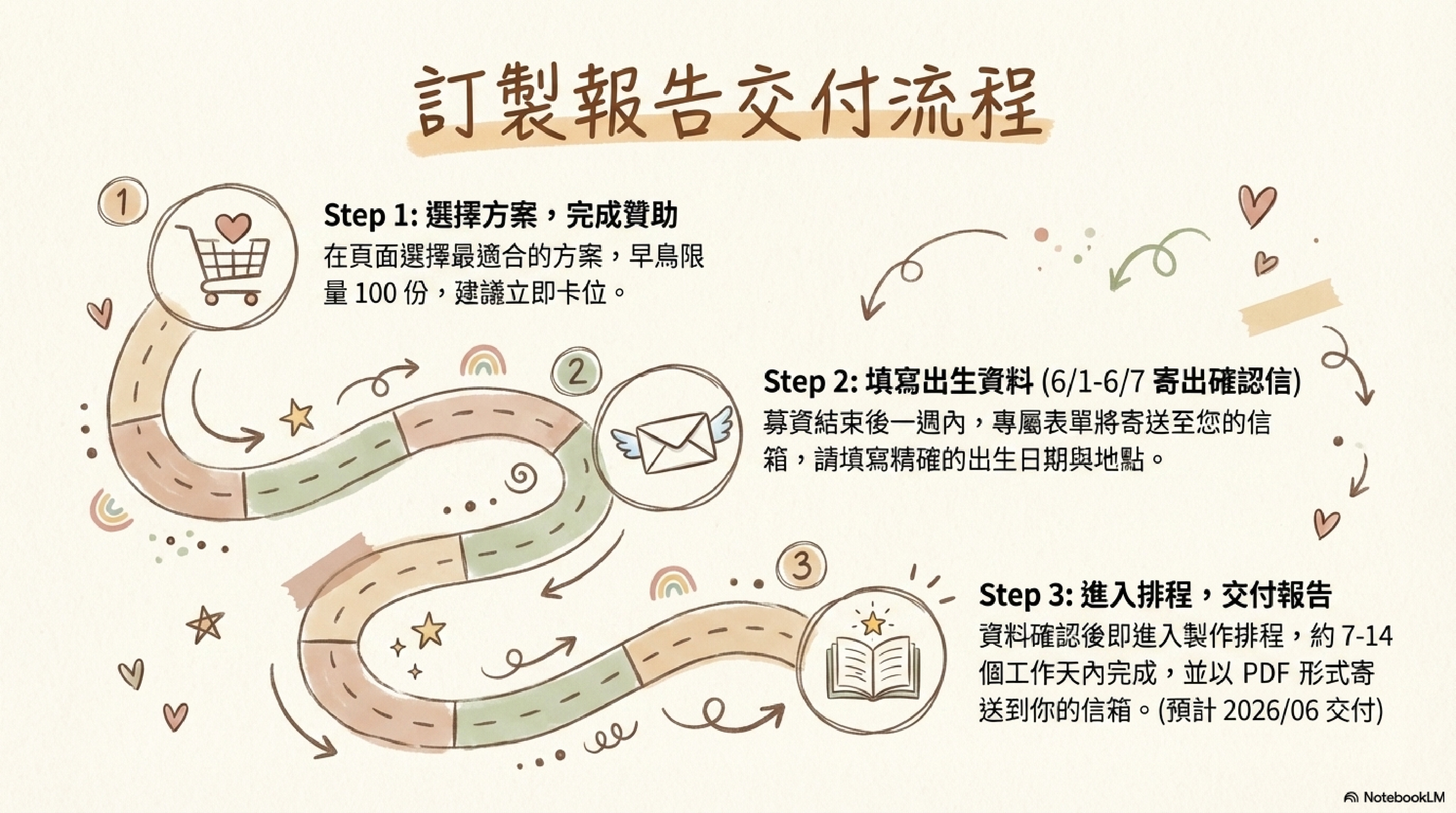資料確認後即進入製作排程,約 7–14 個工作天內完成,並以 PDF 形式寄送到你的信箱。